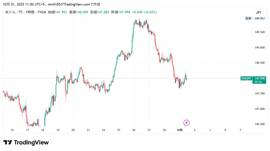 なかなか綺麗な三尊ができていました。147.5まで粘ろうかなと思ったのですが、JOLTS求人が予想よりよかったということと、米政府閉鎖のニュースでどうなるかよくわからなかったので利確しました!